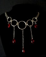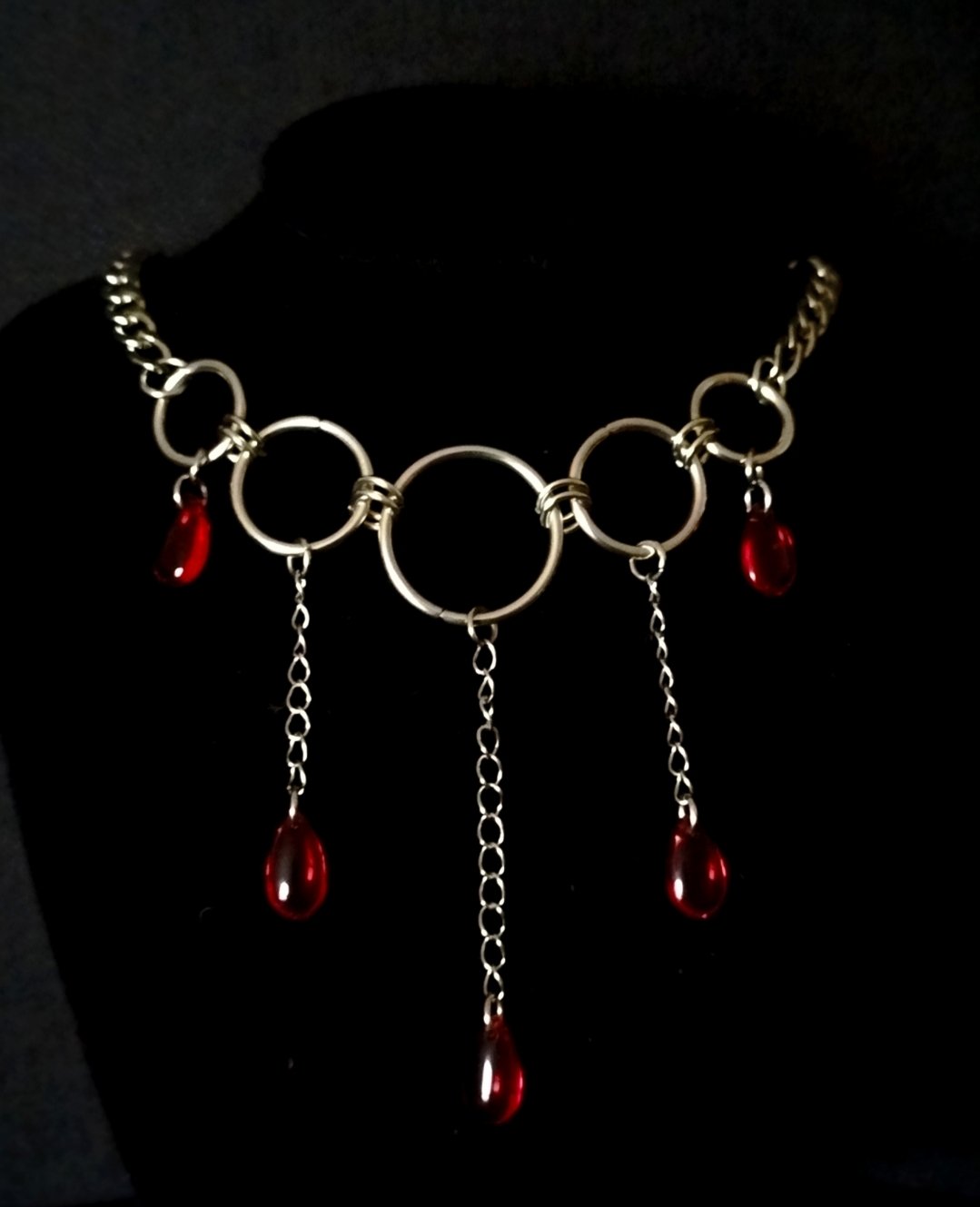 This handmade necklace blends medieval inspiration with a gothic vampire aesthetic. Crafted from silver-toned chain links and large rings, it features delicate dangling chains finished with deep red translucent drop beads, evoking drops of blood and candlelight. Dark, elegant and slightly dramatic, this piece is designed to stand out while remaining refined. A statement necklace for lovers of gothic, medieval and mystical jewelry.